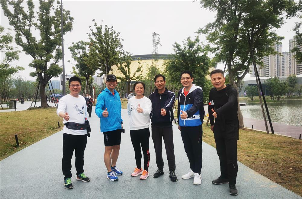 4月16日上午,商会郭一群、胡思新、厉锡平等会员在拱墅亚运公园长跑