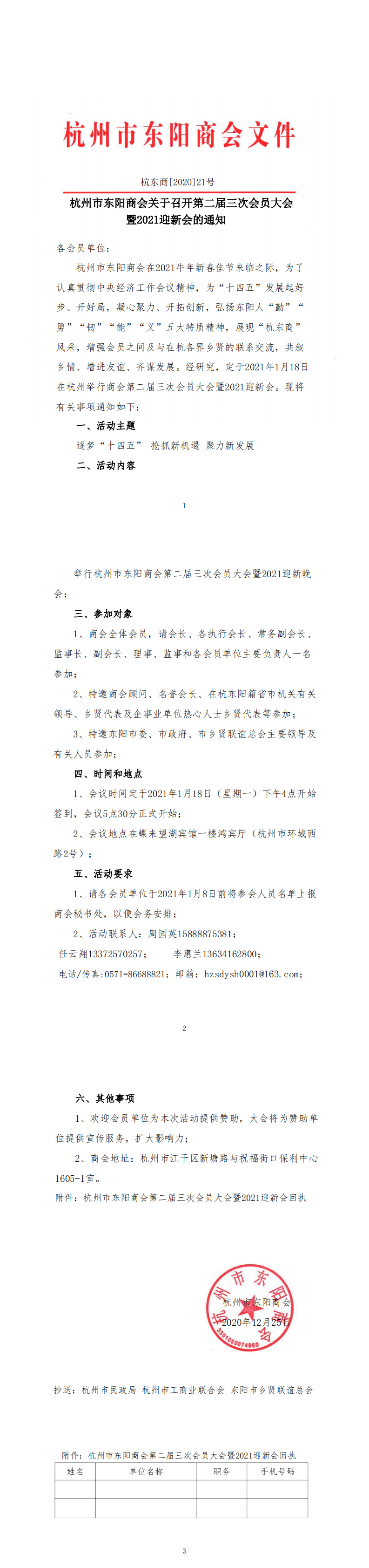 杭州市东阳商会关于召开第二届三次会员大会暨2021迎新会的通知