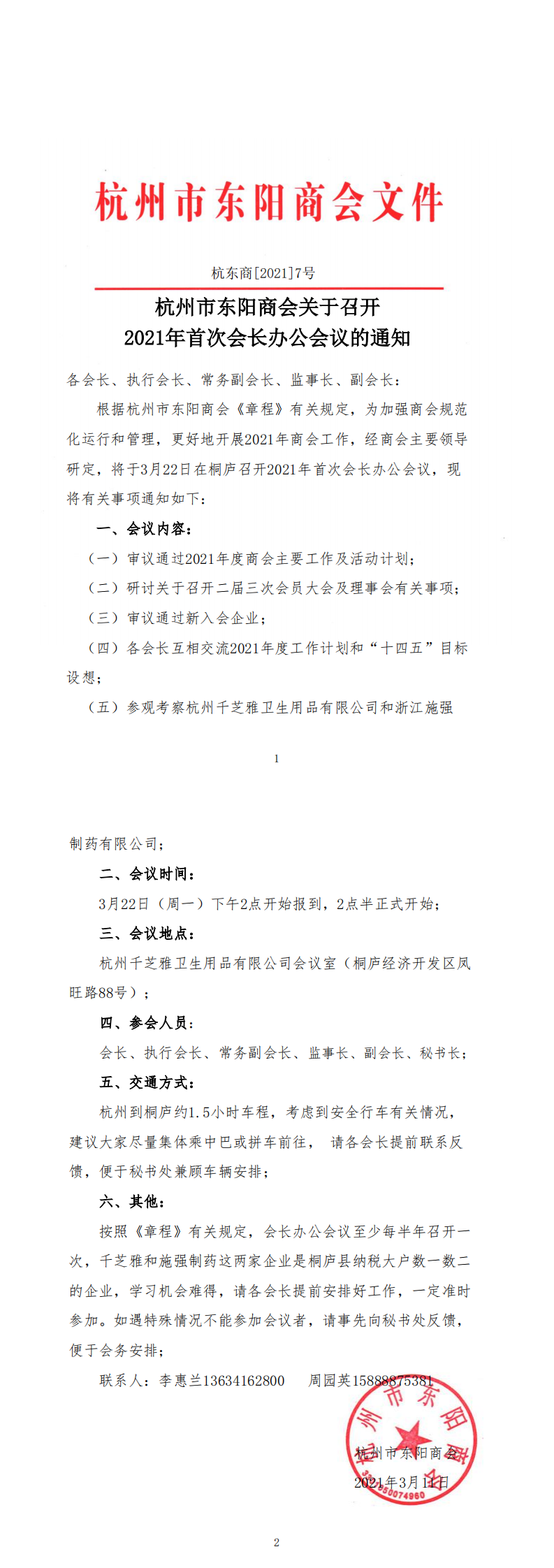 杭州市东阳商会关于召开2021年首次会长办公会议的通知
