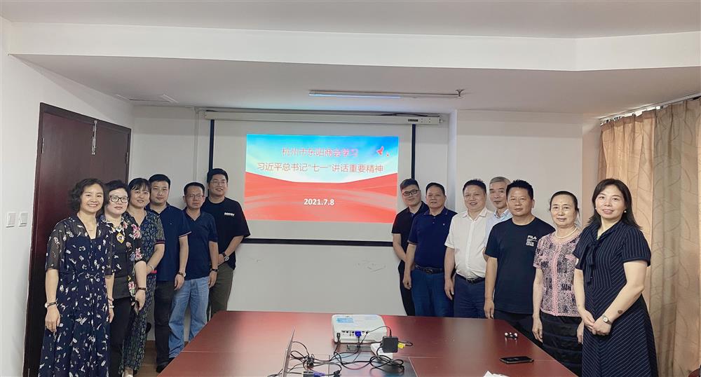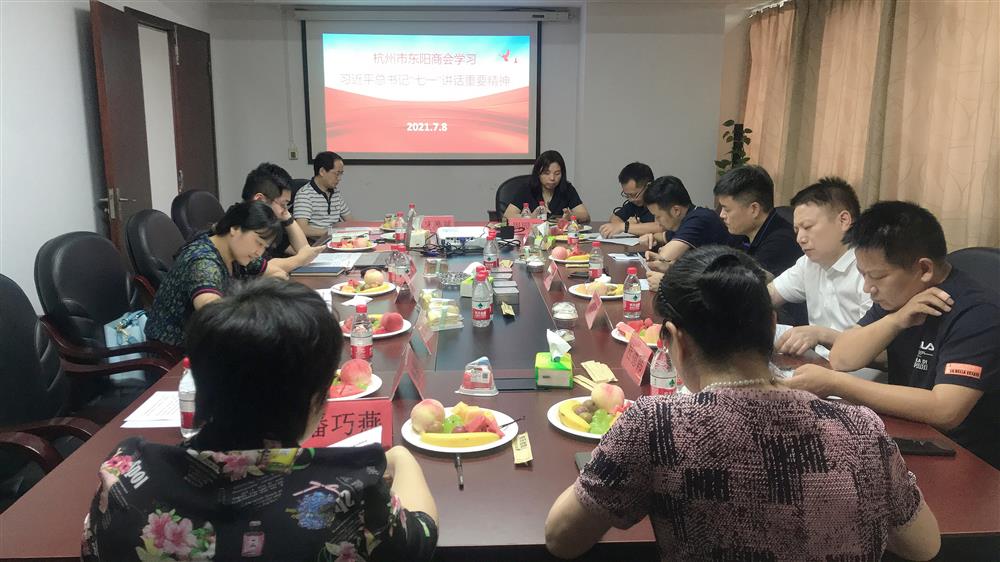 7月8日下午,杭州市东阳商会认真学习贯彻“习近平总书记在庆祝中国共产党一百周年大会上的重要讲话精神”专题会在浙江普华会计师事务所会议室举行。监事长施秀伟、副会长杜德韩、吴祖跃、李飞白、监事潘巧燕、理事楼洪海、陈鑫范、蔡琳红、会员金祖军等16人参加,学习活动由商会秘书长李惠兰主持。
