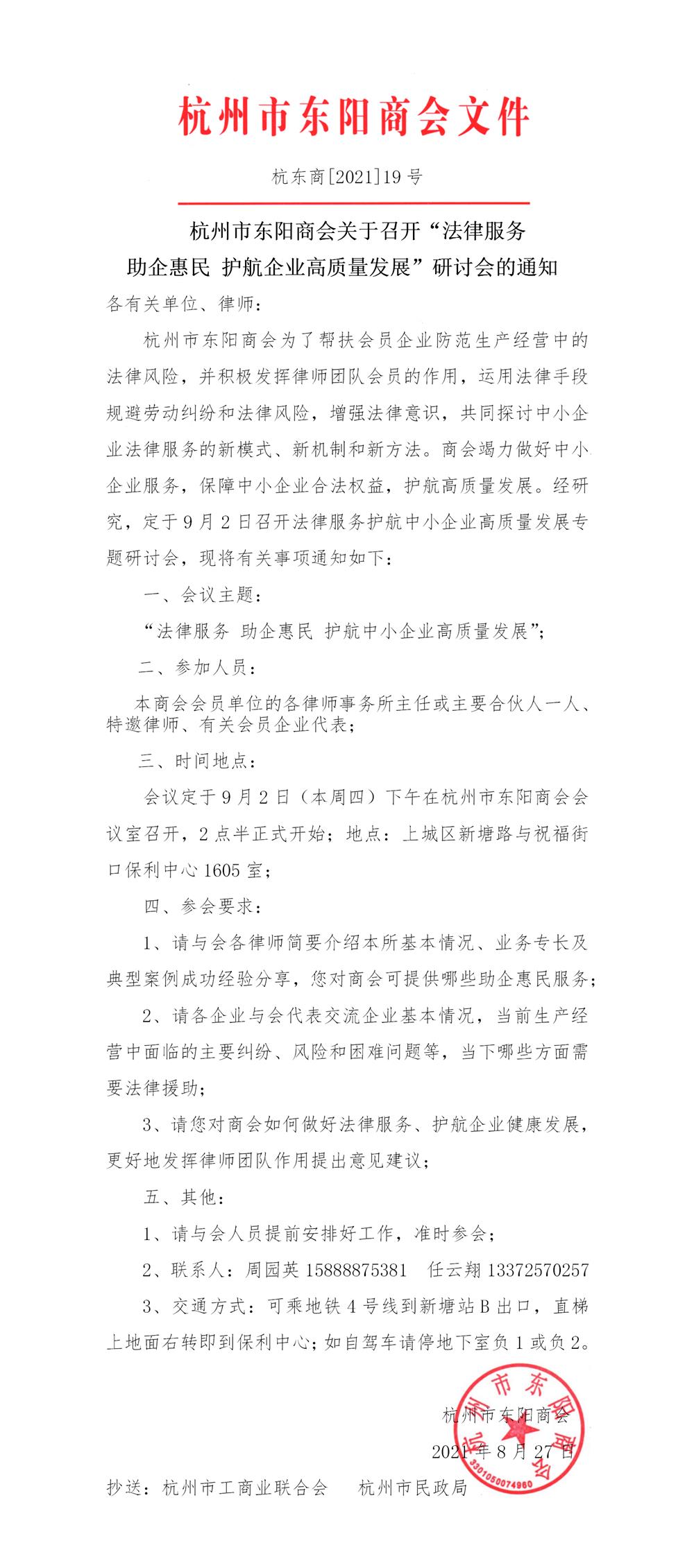 杭州市东阳商会关于召开“法律服务 助企惠民 护航企业高质量发展”研讨会的通知