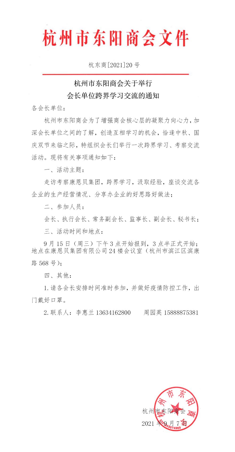 杭州市东阳商会关于举行会长单位跨界学习交流的通知