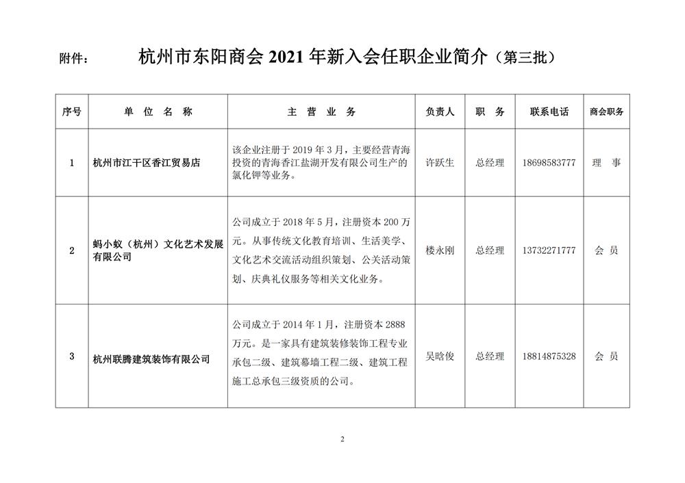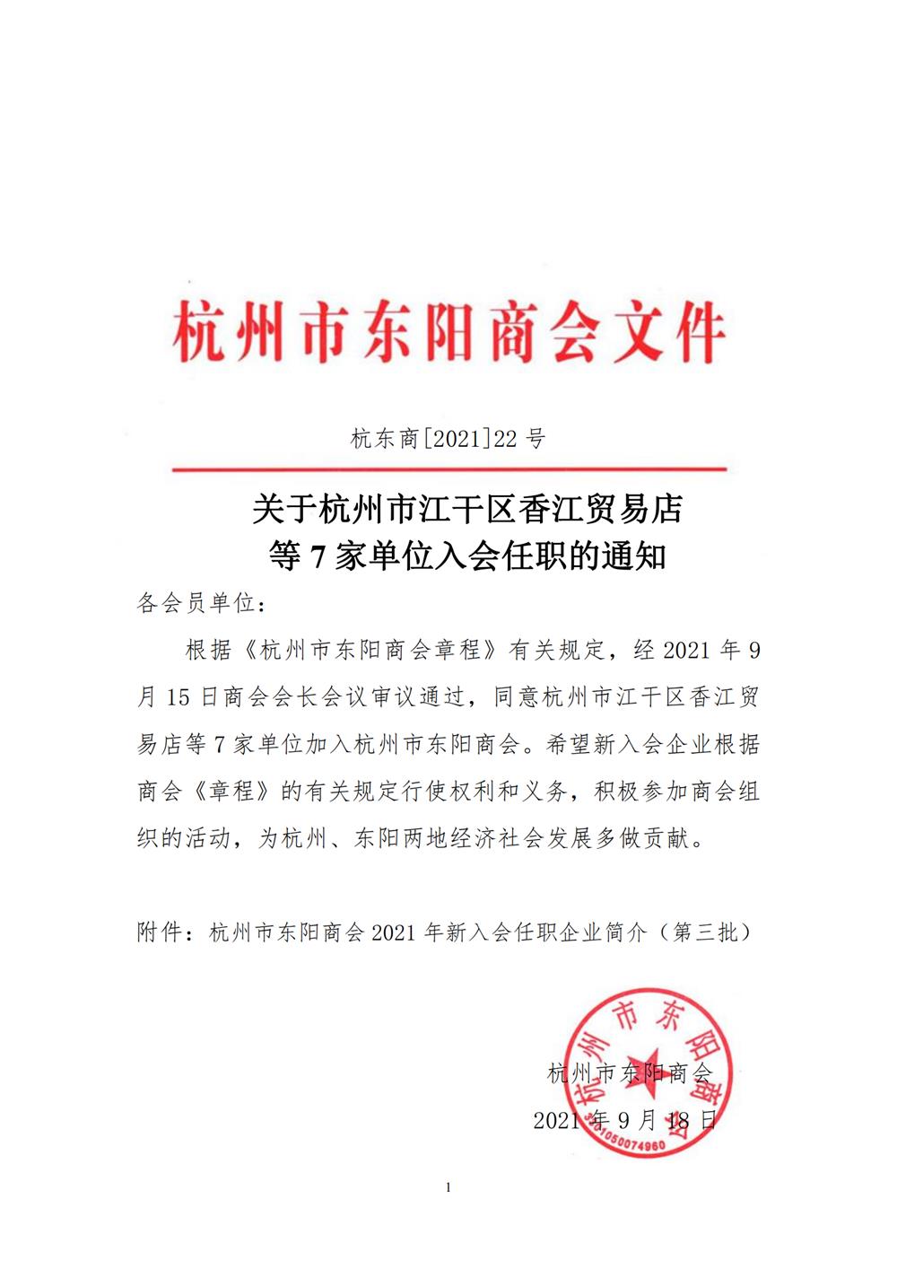 关于杭州市江干区香江贸易店等7家单位入会任职的通知
