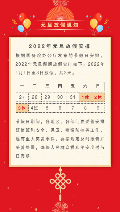 2022年1月1日至3日放假,共3天。1月4日(周二)正常上班。