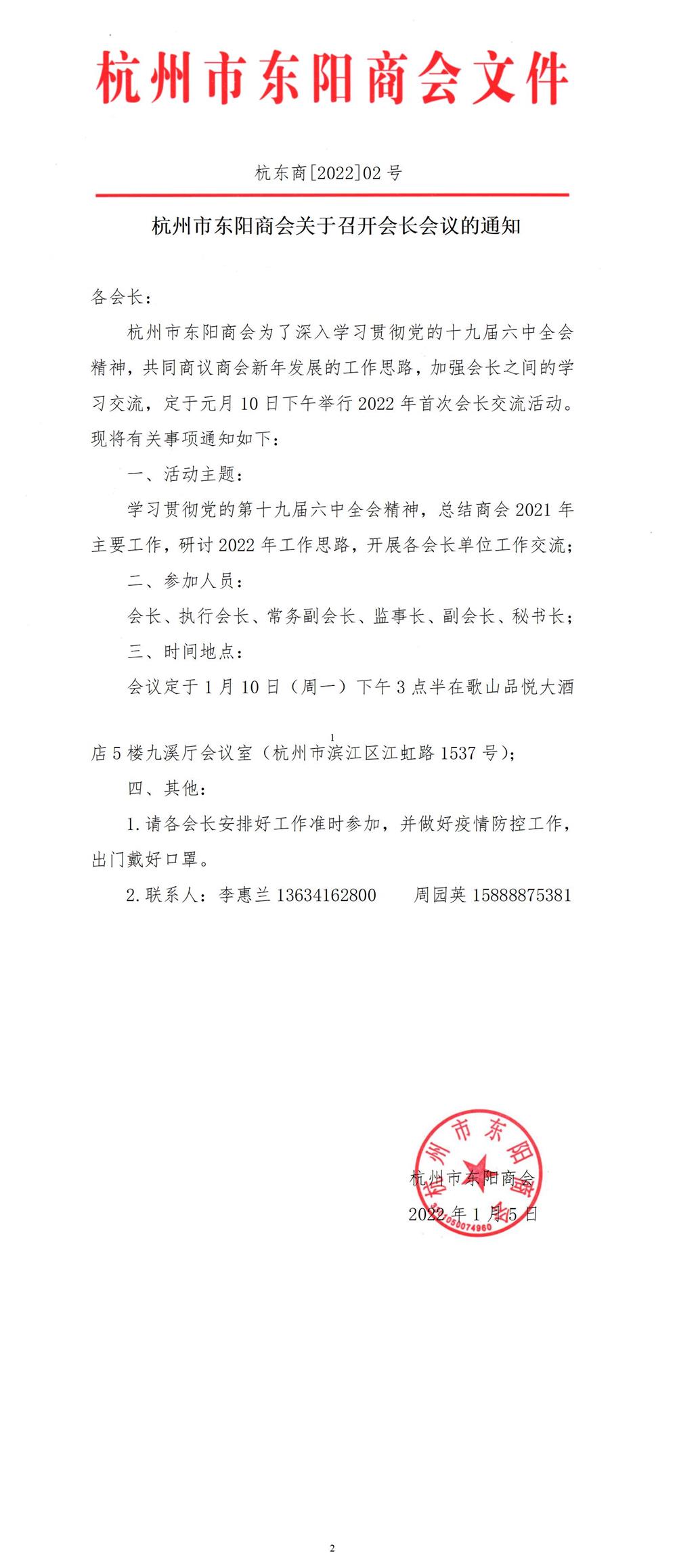 杭州市东阳商会关于召开会长会议的通知