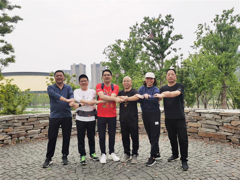 4月16日上午,商会部分会员跑友在亚运公园内紧紧携手,一起向未来