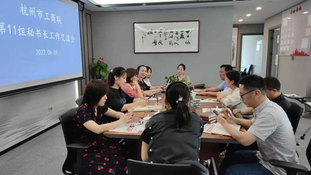 6月9日下午,杭州市工商联第11组秘书长工作交流会在杭州东阳商会举行,会议主题为分享交流各商会2022年上半年主要工作及下半年计划。来自杭州市永嘉商会、奉化商会、广西商会、徐州商会、阜阳商会、乐平商会、郴州商会、安吉商会、鹿城商会秘书长等共19人参加。会议还邀请了杭州市民政局曾欣华处长到会指导。会议由第11组组长、杭州市永嘉商会秘书长叶建晓主持。