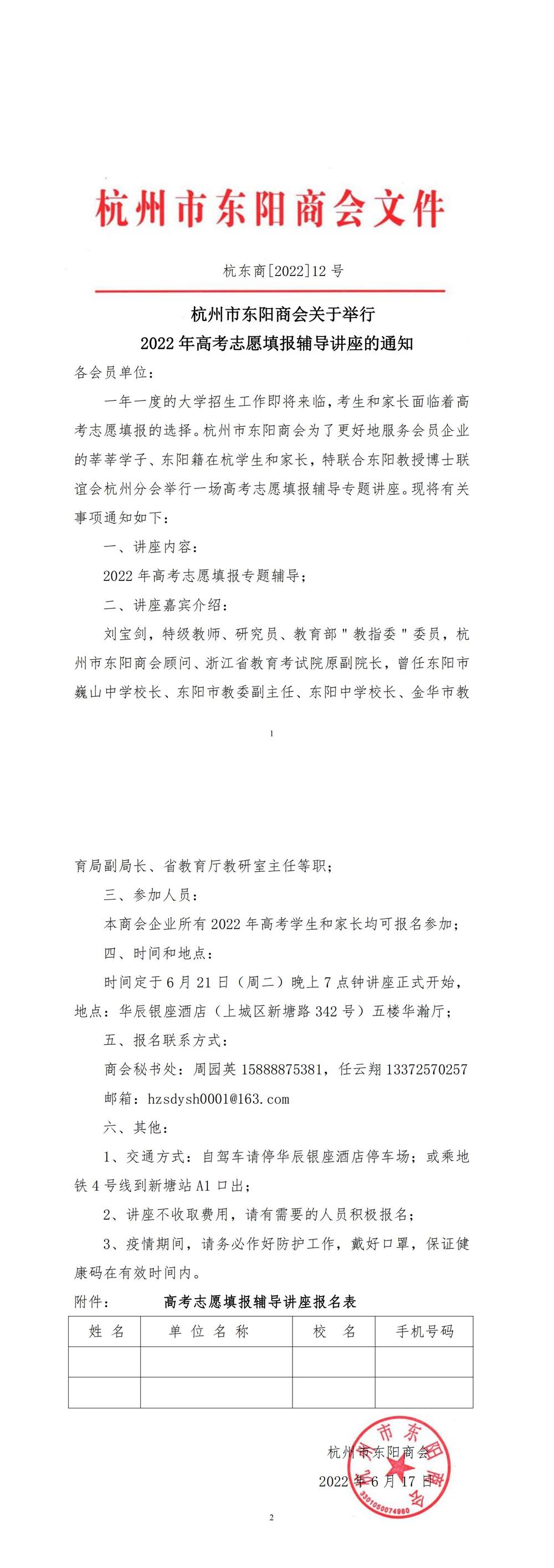 杭州市东阳商会关于举行2022年高考志愿填报辅导讲座的通知