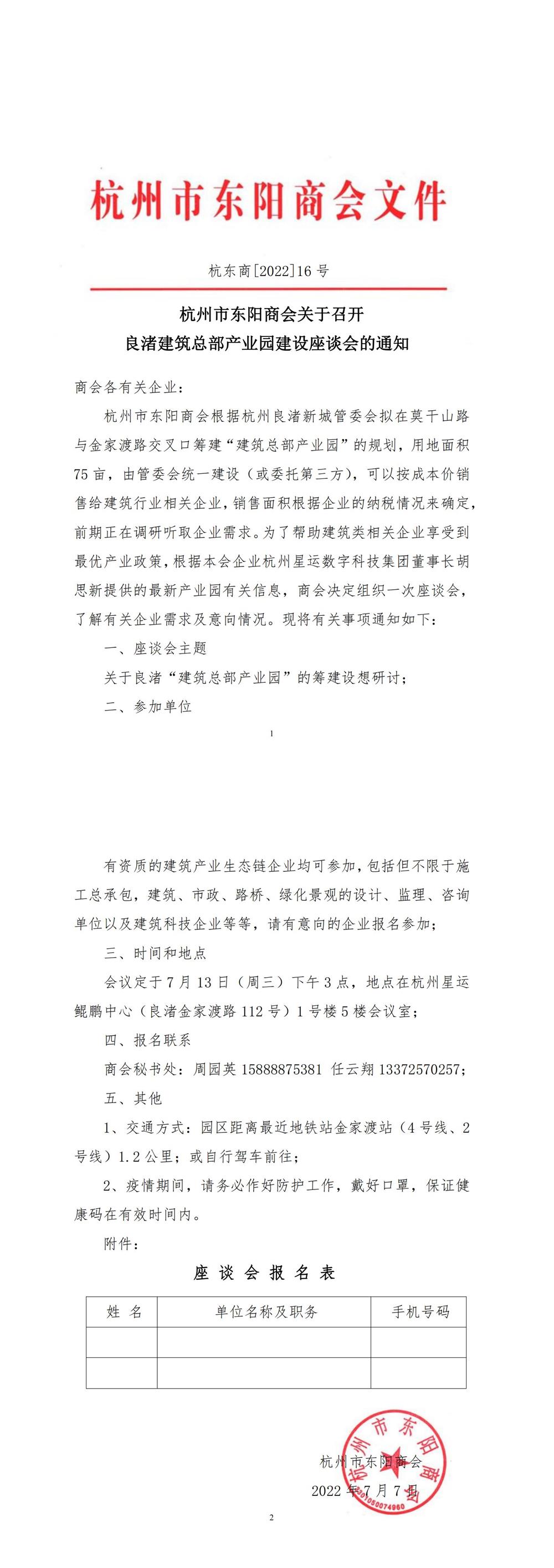 杭州市东阳商会关于召开良渚建筑总部产业园建设座谈会的通知