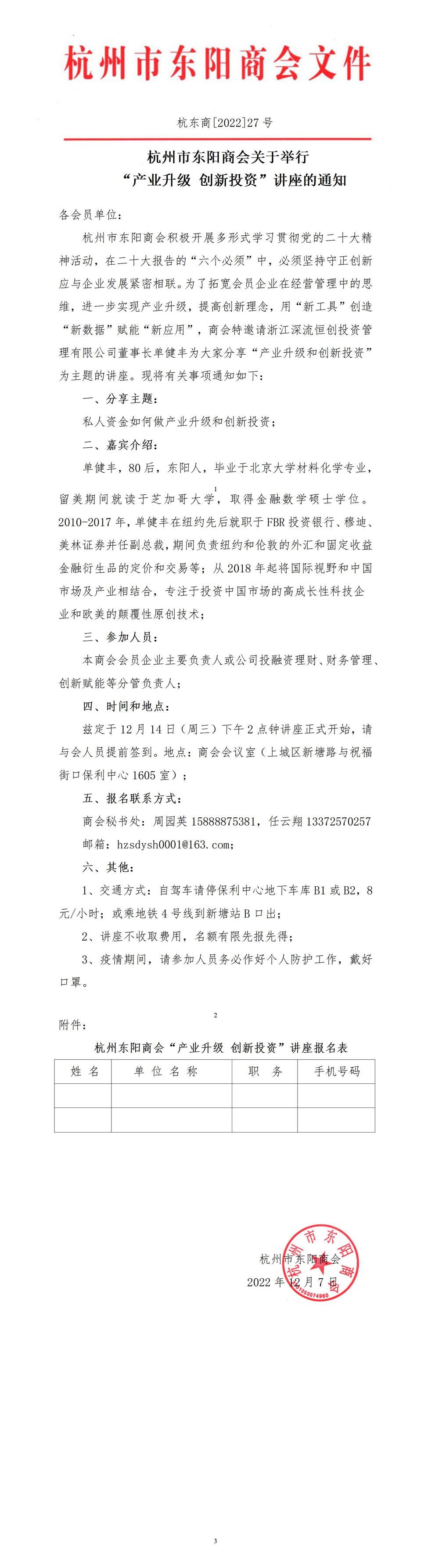 杭州市东阳商会关于举行“产业升级 创新投资”讲座的通知