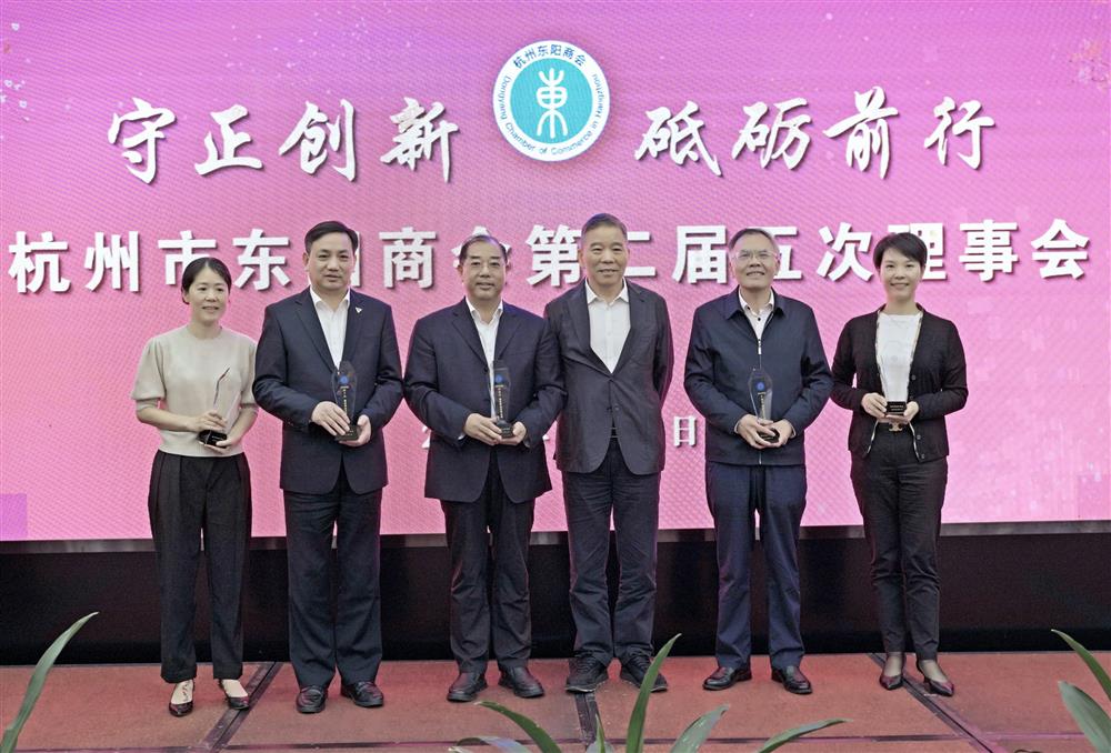 优秀乡贤、浙江农林大学党委书记沈满洪教授为创建“专精特新”中小企业先进单位颁奖;常务副会长俞蘠、王嘉琳分别对商会2022年度先进会员单位和先进个人颁奖;常务副会长朱建星和申屠祖斌分别对荣获东阳市乡贤联谊总会的2021年度和2022年度突出贡献先进个人和先进个人颁奖;商会会长、中天控股集团有限公司董事长楼永良对沈满洪教授等服务商会优秀乡贤颁发奖杯。