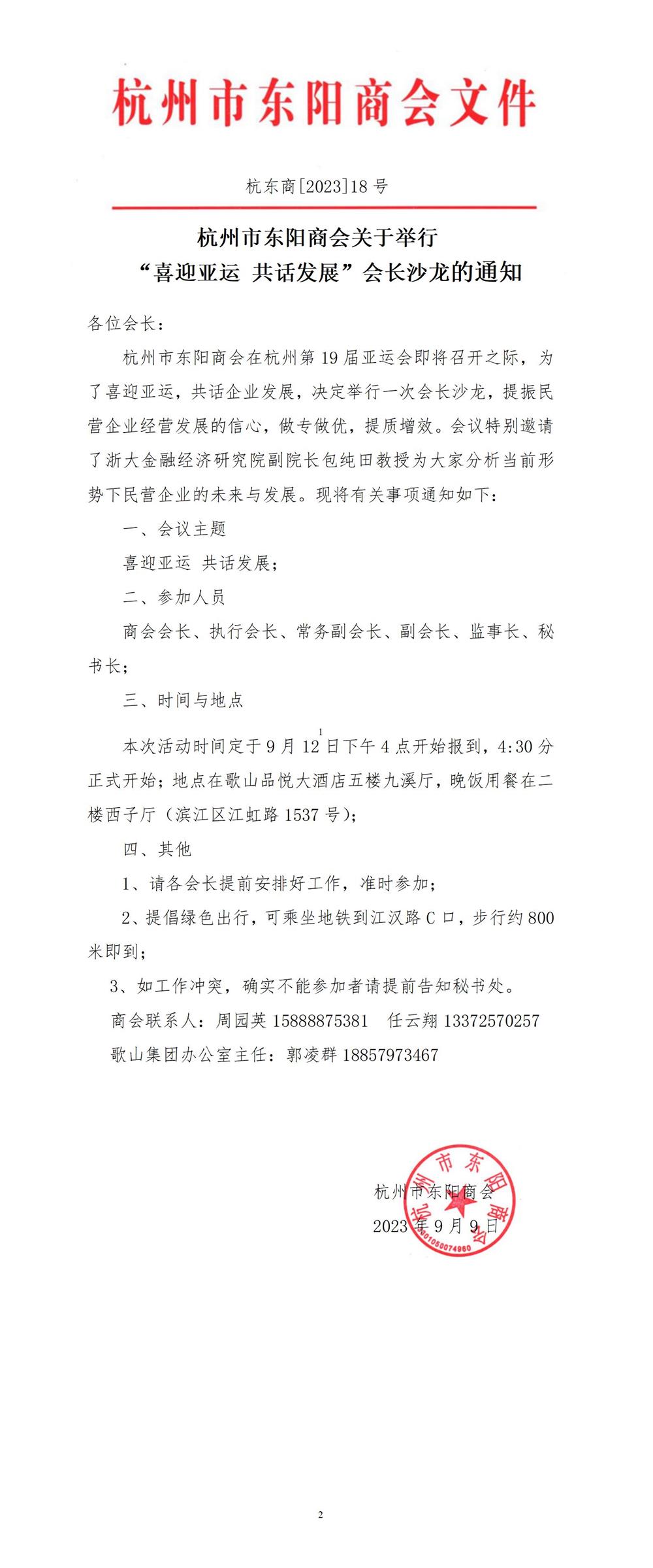 杭州市东阳商会关于举行“喜迎亚运 共话发展”会长沙龙的通知