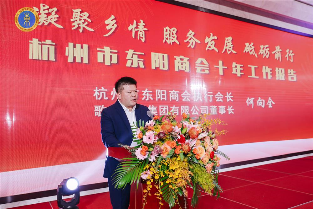 杭州市东阳商会执行会长、歌山建设集团有限公司董事长何向全受楼永良会长的委托作了《凝聚乡情 服务发展 砥砺前行——杭州市东阳商会十年工作报告》。报告从凝心聚力,唱响服务会员“最强音”;整合资源,做好服务乡贤的“娘家人”;回报桑梓,绘就家乡发展“锦绣图”;热心慈善,奏响慈善担当“爱心曲”;加强建设,铸就展示东阳的“金名片”;党建领航,铸就商会发展“新高度”等六个方面总结回顾了商会成立十年来的发展历程。展望未来,商会将继续坚持党建引领,创新服务能力,凝心聚力,再创辉煌。
