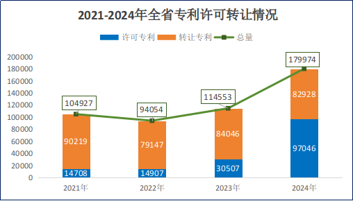 白皮书显示,2024年,全省专利转让许可次数达18万次,同比增长57.11%,转化规模首次位居全国第一;同时,累计发布专利开放许可声明1192次,达成开放许可2230次,同样位居全国榜首。