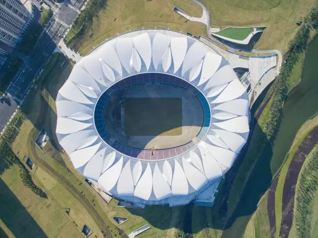 它由28片大花瓣和27片小花瓣组成,看起来动感飘逸,事实上却是由钢结构制成。整个钢罩棚外边缘南北向长约333米,东西向长约285米,总用钢量达2.6万吨,比北京“鸟巢”少2.7万吨。