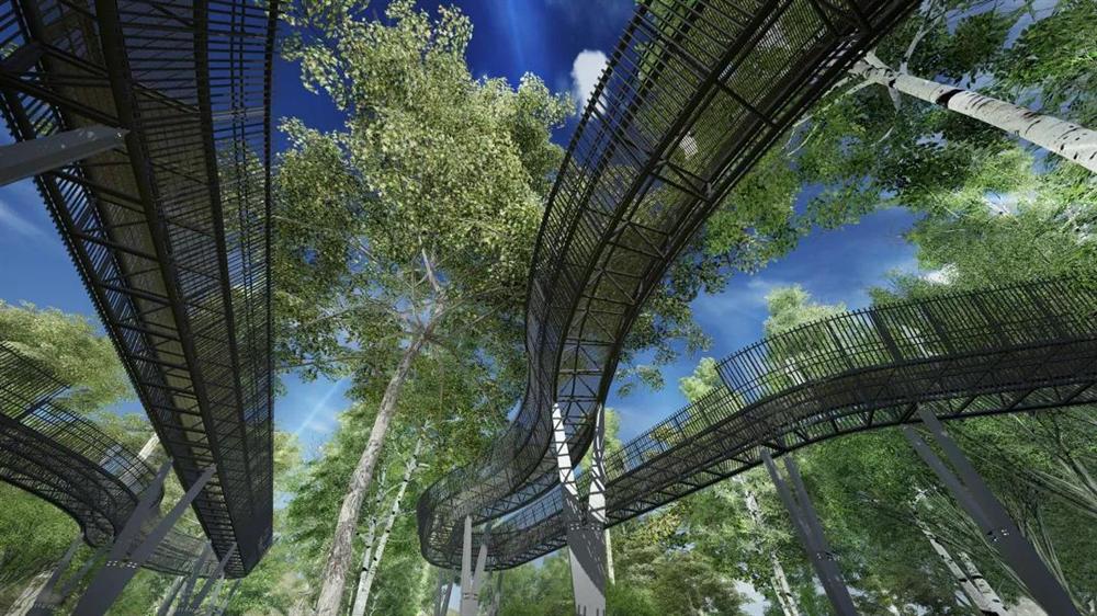 这种做法能保证整个步道用钢结构作支撑,悬在半空中,空心铁架镂空设计不影响步道下面植物的生长,也不容易积水。遇到植物,或绕过,或从步道上穿过,继续生长,最大程度地保护了原有生态。