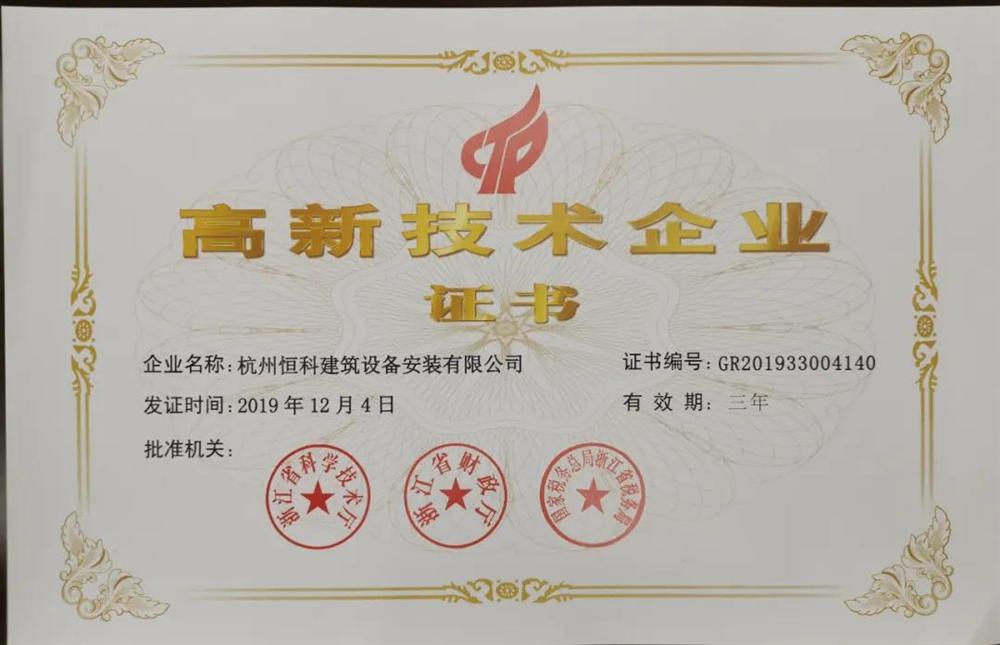 3月25日,杭州市东阳商会理事单位杭州恒科建筑设备安装有限公司(以下简称“恒科安装公司”)荣获国家高新技术企业称号。